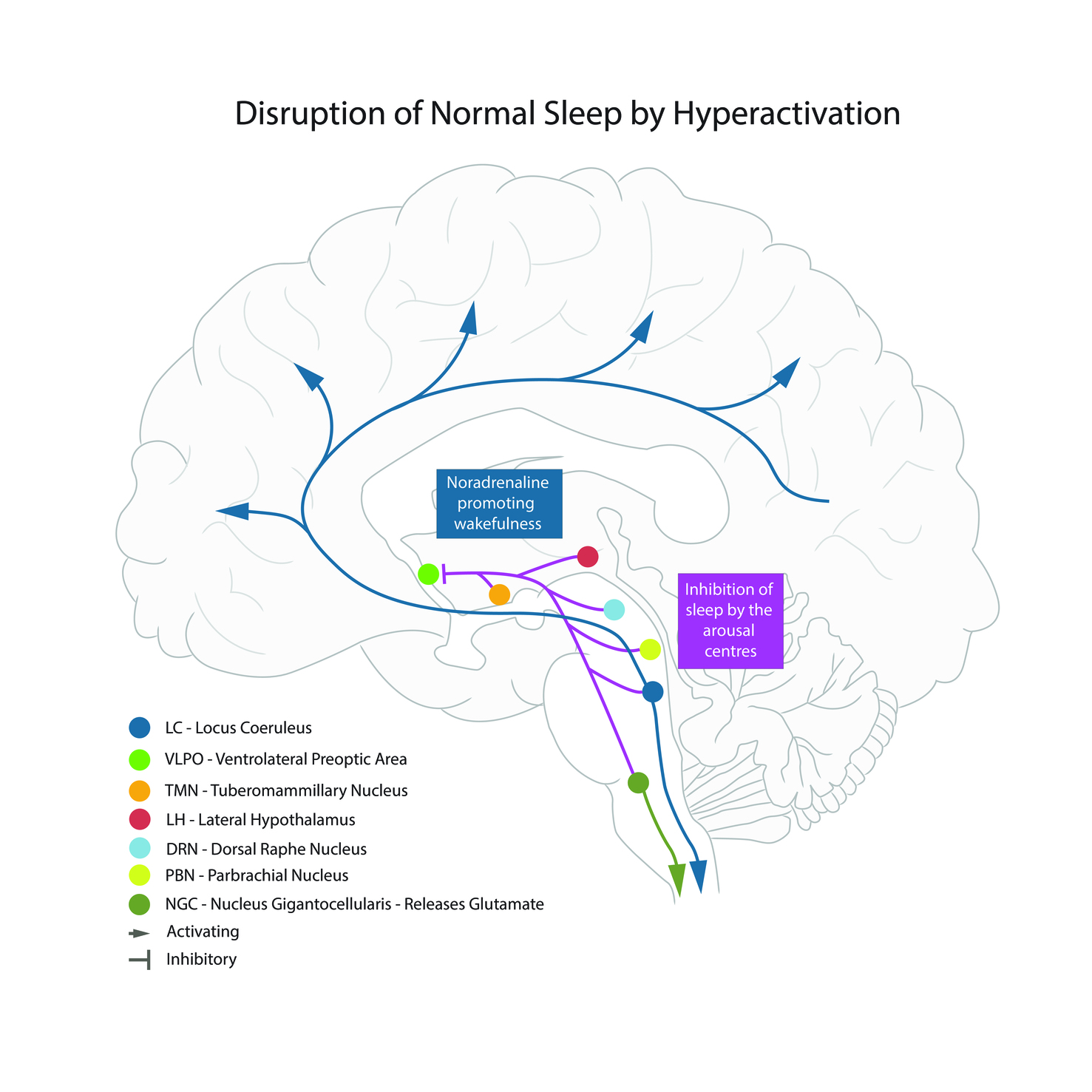 Where is the hub of the Hyperarousal response? The LC alarm reaction, with its dense web of norepinephrine (NE) activated neurons, spreads upward to all brain regions, and downward into the body. This integrated alarm response produces intense activation of all nearby brainstem centres including the Reticular Activating System, Dorsal Raphe, and the Orexin-Thyroid system in the Lateral Hypothalamus (LH). These brainstem centres both activate shock reactions, preparing the body for response to danger, as well as shutting down the organism’s sleep drive. Effective trauma treatment needs to be Sleep-Informed and target quieting the brainstem’s LC arousal hub.